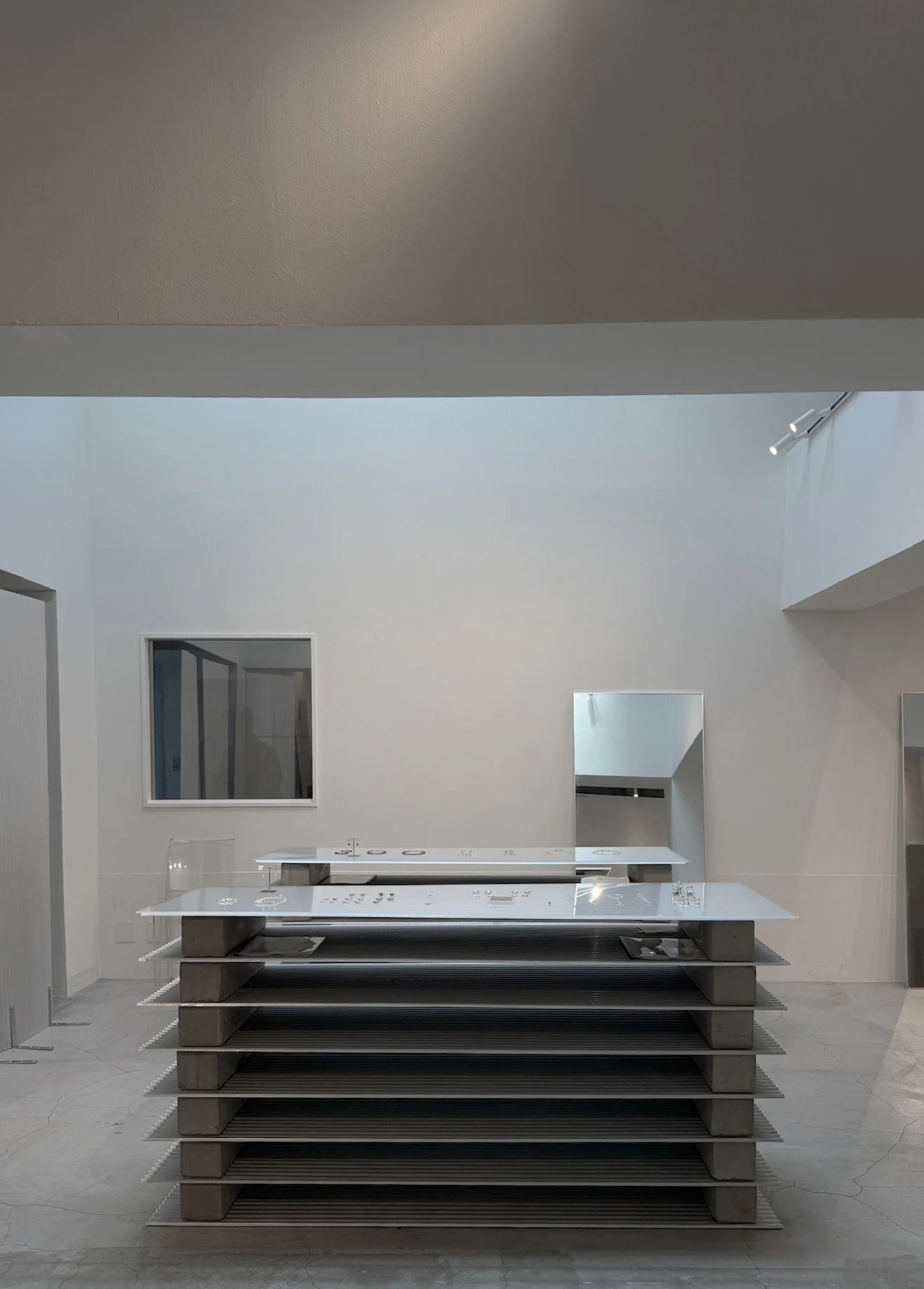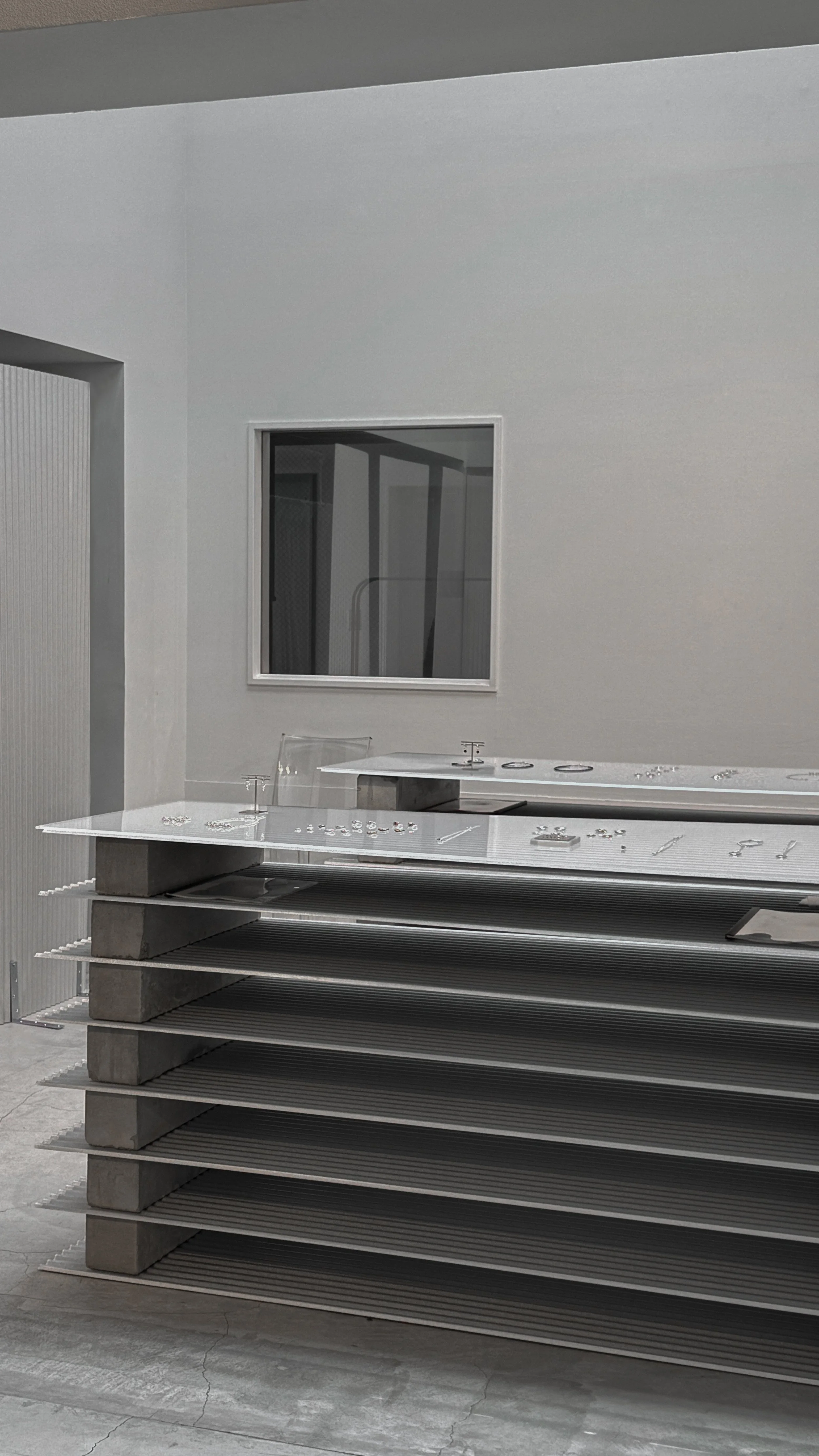 한국어 / 본 프로젝트는 ‘재료의 태도’에 초점을 맞추었습니다. 특별한 마감이나 고가의 소재에 의존하기보다, 누구나 홈센터에서 구할 수 있는 재료의 물성과 구조적 배치만으로 공간의 밀도를 형성하고자 했습니다.갈바리움 강판을 원통 형태로 말아 자립하는 오브제로 설치하고, 콘크리트와 레이어 구조로 구성함으로써 금속의 차가움과 콘크리트의 거친 질감이 대비되도록 했습니다. 공업적이고 무기질적인 소재의 조합은 오히려 주얼리의 섬세함과 정밀함을 더욱 선명하게 부각시킵니다. 또한 시공 기간이 짧은 팝업의 특성을 고려하여, 구조 자체가 하나의 아트피스로 기능하도록 설계했습니다.이 프로젝트는 일상적인 재료가 맥락에 따라 얼마나 다른 표정을 가질 수 있는지, 그리고 제한된 조건 속에서도 공간은 충분히 세련될 수 있다는 가능성을 제시합니다.