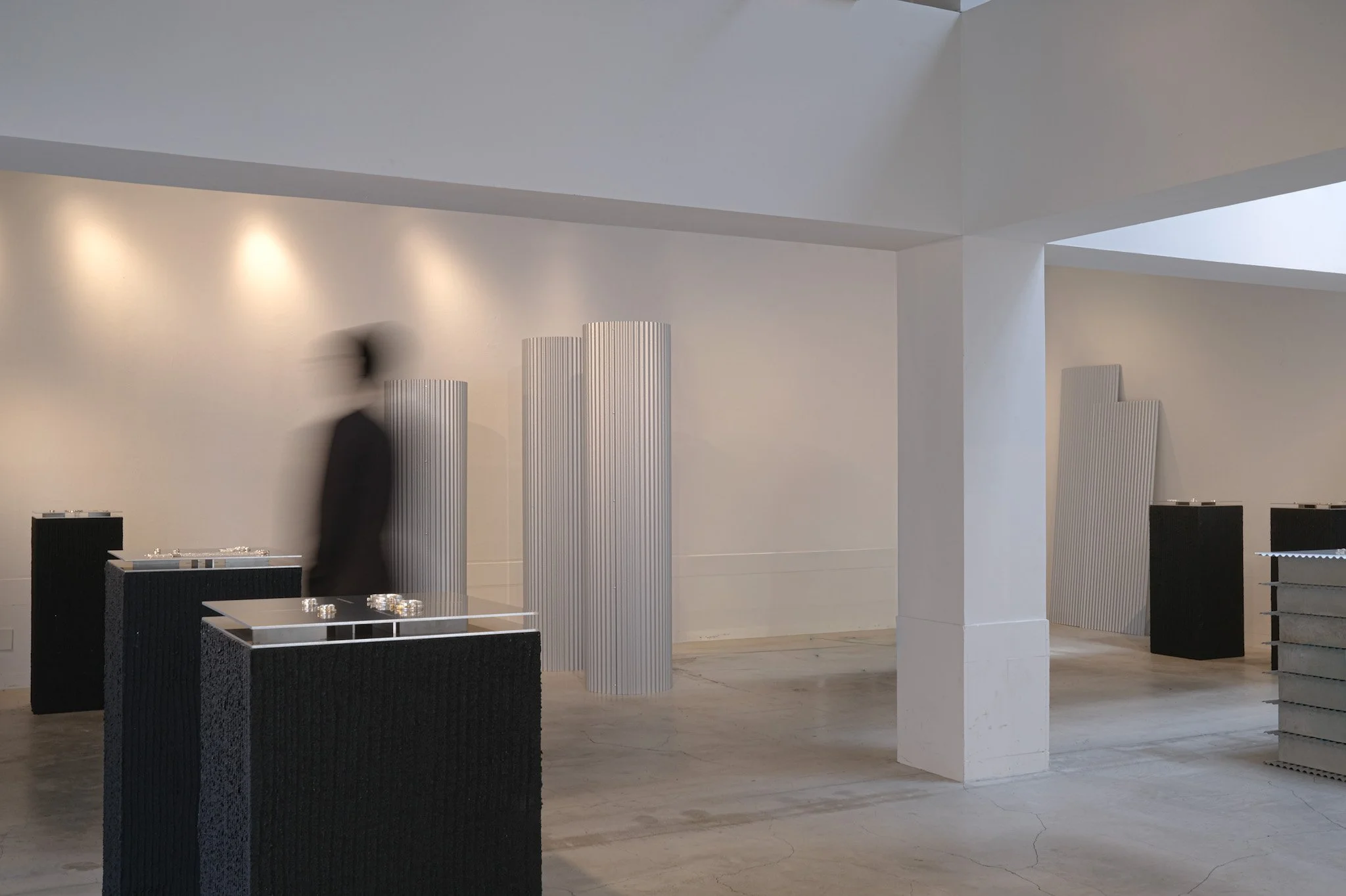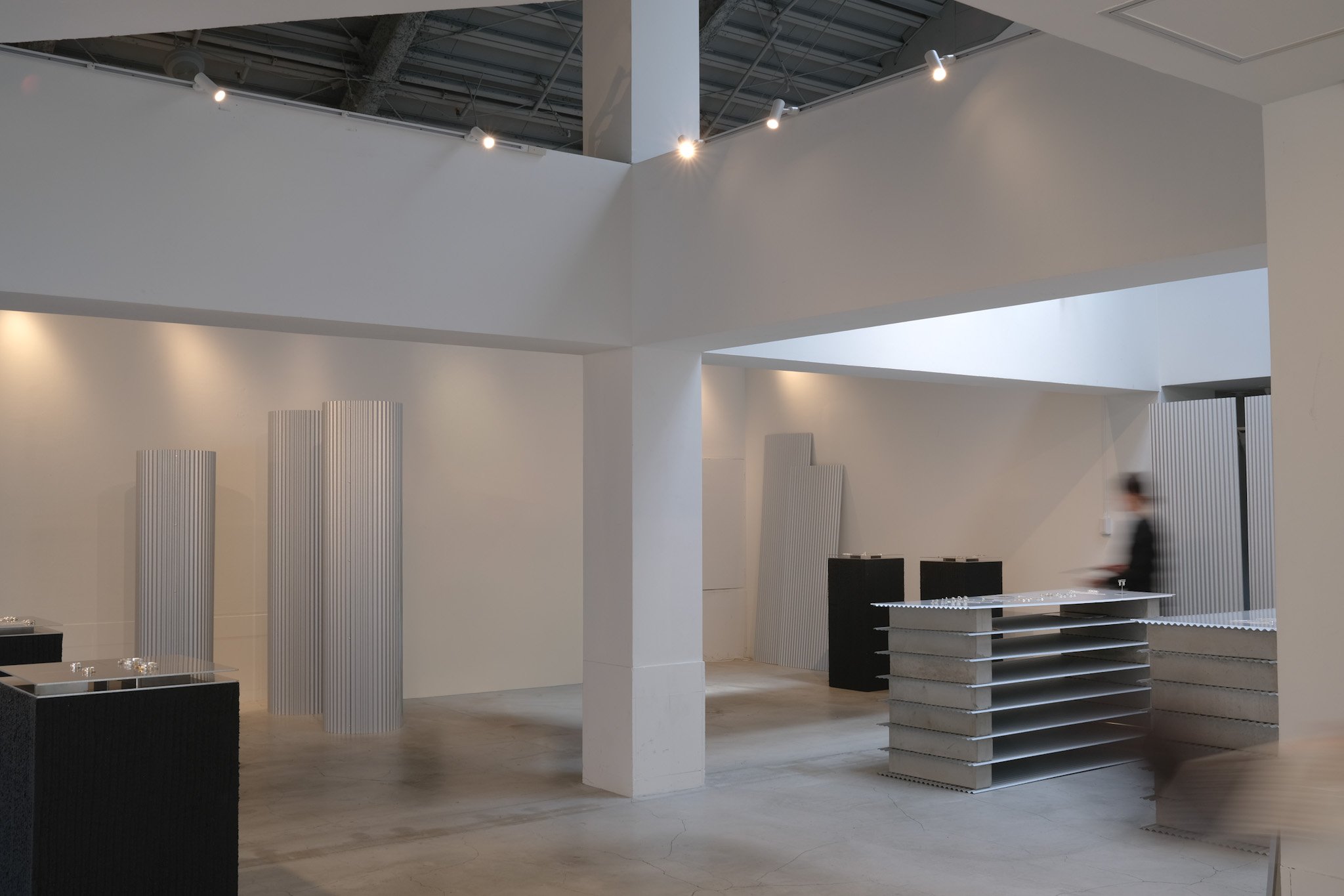 本プロジェクトでは「素材の態度」に焦点を当てました。特別な仕上げや高価な素材に頼るのではなく、誰もがホームセンターで手に入れられる素材の物性と構造的な配置のみで、空間の密度を形成することを試みました。ガルバリウム鋼板を円筒状に巻き、自立するオブジェとして設置し、コンクリートとレイヤー状に構成することで、金属の冷たさとコンクリートの粗い質感が対比されるようにしています。工業的で無機質な素材の組み合わせは、かえってジュエリーの繊細さと精度をより一層際立たせます。また、施工期間が短いポップアップの特性を踏まえ、構造そのものがひとつのアートピースとして機能するよう設計しました。