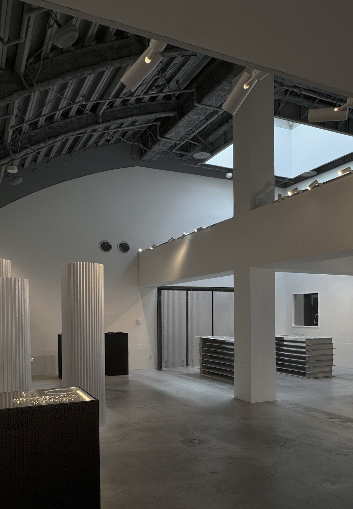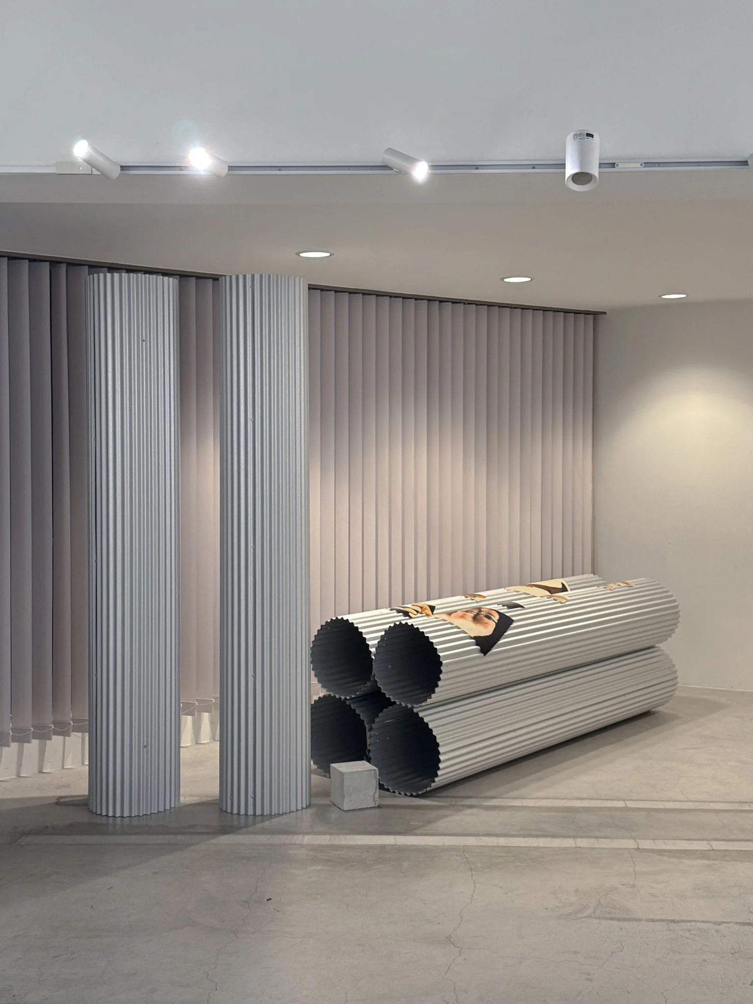 English / This project focuses on the “attitude of materials.” Rather than relying on special finishes or expensive materials, we sought to create spatial density using only the inherent properties and structural arrangement of materials that anyone can easily obtain at a home improvement store. Galvalume steel sheets were rolled into cylindrical forms and installed as self-standing objects. Layered with concrete, the composition creates a contrast between the coldness of metal and the rough texture of concrete. The industrial and impersonal combination of materials, in turn, further highlights the delicacy and precision of the jewelry. Considering the short construction period typical of pop-up spaces, the structure itself was designed to function as a single art piece. This project proposes the possibility that everyday materials can take on entirely different expressions depending on context—and that even under limited conditions, a space can achieve a refined presence.